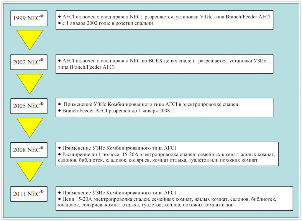 AFCI впервые вошёл в NEC в 1999 году на основе обоснования построенного из статистики электрических пожаров. В первую очередь требовалась их установка в спальнях, так как по статистике много пожаров происходит именно в этих комнатах, в то время когда люди спят. NEC 1999 требует, начиная с 1 января 2002 года, чтобы все розетки спальни были защищены с помощью Branch Feeder¹¹ AFCI. NEC 2002 расширила применение AFCI для защиты не только розеток, но и всей эдектропроводки спальни. Впоследствии NEC 2005 разрешает использование Branch Feeder AFCI только до 1 января 2008 года, после чего требовалось установка Сombination¹² AFCI. Сombination AFCI позволяют обнаруживать малый ток последовательной дуги в подключённых кабелях. NEC 2008 расширила защиту AFCI для следующих помещений: жилые семейные номера, столовые, гостиные, кабинеты, библиотеки, кладовки, спальни, солярии, комнаты отдыха, шкафы-купе, прихожие, или аналогичные помещения или участки. NEC 2011 расширила требование AFCI к существующим домам. Рисунок 3 показывает прогрессирование NEC и на рисунке 4 представлен конкретный вариант одобрения NEC штатами страны или местной юрисдикцией в пределах штата.